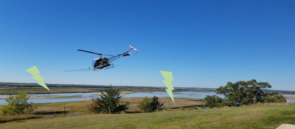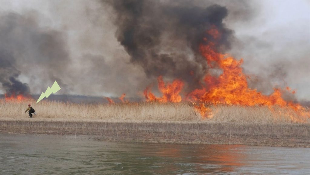 Further north, the FOTWW-COE stopover habitat evaluation team visited COE Lake Francis Case in North Dakota (9-11-2019). This lake is 107 miles long, at normal pool. Significantly the shoreline length is 540 miles with numerous areas where Whooping Cranes can stopover to rest, forage and roost for a day or so during their two 2,400 miles migrations each year. Like so many areas on most lakes, phragmites is a problem. The good news is that Aaron Gregor, Wildlife Biologist and James Lynde are using helicopters to spray herbicides on the invasive plants and, after the sprayed plants dry, they will be burned (Figure 5).